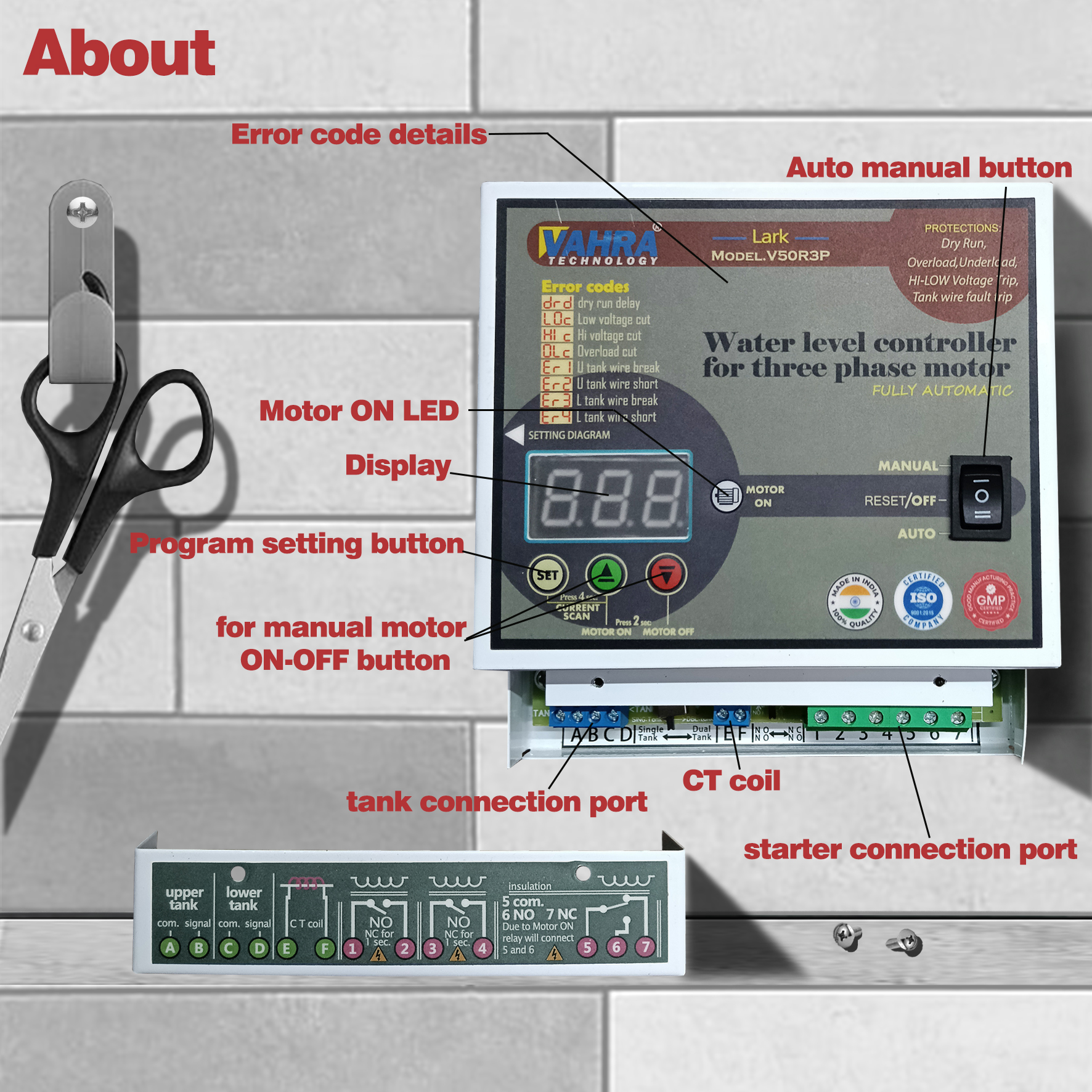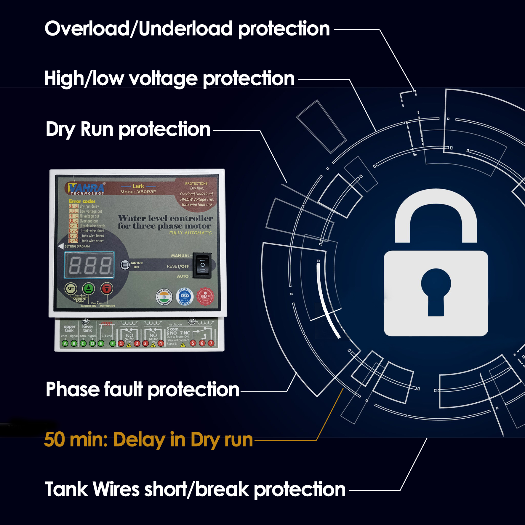 The LARK/V50C1P is a fully automatic three-phase water level controller designed for submersible motors. It works with DOL and L&T starters, provides phase break protection, and protects your motor from dry run, overload, and high/low voltage. Compatible with carbon or magnetic sensor kits, it is easy to install and saves water, time, and energy.